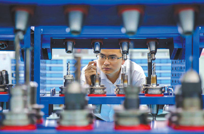 中国船舶集团的数控工艺师在检查用于精密机械制造的数控加工刀具。