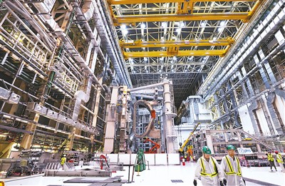 工作人员在位于法国圣保罗-莱迪朗斯的国际热核聚变实验反应堆(ITER)的预组装大厅里忙碌。