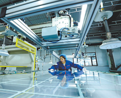 甘肃省张掖市民乐生态工业园区的甘肃大民新材料光伏组件生产线上,工作人员正在检测覆膜前光伏组件。